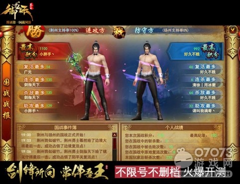首場國戰(zhàn)為荊州勢力對陣揚州勢力,荊州勢力的玩家從邊境長驅(qū)直入,迅速擊敗陽平關(guān)、王城郊外守將NPC,最后強勢擊殺揚州方面大將軍。攻入王城內(nèi)城。