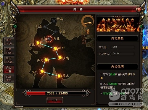 8090刺沙中內(nèi)功分為多重,而每一重又分為梁丘、箕門、關(guān)元、少商、腹中、曲池、靈墟、華蓋、天鼎以及神庭十大穴位。游戲張內(nèi)功可以抵消角色受到的部分傷害,能為角色帶來(lái)戰(zhàn)力加成。內(nèi)功值越高,內(nèi)功抵傷也就越高,帶來(lái)的戰(zhàn)力也更多。玩家通過(guò)消耗內(nèi)功經(jīng)驗(yàn)可以提升內(nèi)功層級(jí),以獲得更高的屬性。將十個(gè)穴位都點(diǎn)亮后,玩家才能將內(nèi)功提升到下一重。