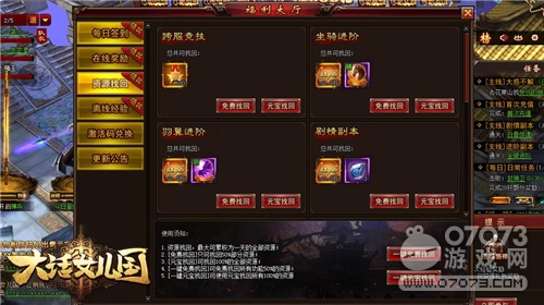 人難免會遇上有事的時(shí)候,實(shí)在沒空登錄游戲也不用擔(dān)心,第二天登錄時(shí)可通過“福利大廳”的“資源找回”,領(lǐng)取離線獎(jiǎng)勵(lì)。資源可謂相當(dāng)豐富,包括跨服競技的功勛,以及羽翼、坐騎進(jìn)階的經(jīng)驗(yàn)及相關(guān)丹藥,還有劇情副本中的經(jīng)驗(yàn)及裝備強(qiáng)化石,都是日常升級必需品,即可使用一鍵免費(fèi)/元寶輕松找回它們。