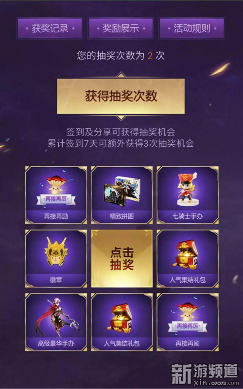 另外每天可以通過簽到和分享分別獲得1次召喚次數(shù),連續(xù)7天簽到可獲得額外的3次召喚次數(shù)!多一次分享就多一次機(jī)會(huì)!一不小心就會(huì)中了下面大獎(jiǎng)。