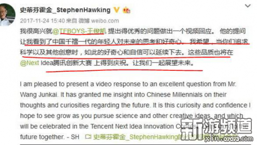 王俊凱之前在微博用英文討教過霍金關(guān)于宇宙的問題,而霍金回應(yīng)到:我很高興就王俊凱提出得優(yōu)秀的問題做出一個(gè)視頻回應(yīng)。他的提問讓我看到了中國(guó)千禧一代的年輕人對(duì)未來(lái)的思考和好奇心。我希望,當(dāng)你們追求科學(xué)以及其他創(chuàng)意時(shí),如此的好奇心和自信可以延續(xù)下去。這些品質(zhì)也將在騰訊創(chuàng)新大賽 上得到慶祝。讓我們一起展望未來(lái)。”