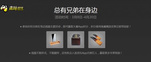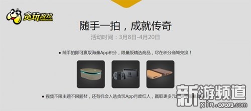 3月8日到4月20日期間,隨手拍即可贏取海量App積分,限量版精選商品,盡在積分商城兌換!視頻創(chuàng)意內(nèi)容不限,可以是生活中的有趣樂(lè)事,也可以是游戲里帥怪的超炫畫面,不限主題不限題材,隨手一拍成就傳奇,并有機(jī)會(huì)入選貪玩App月度紅人,贏取更多元寶更多限量商品!