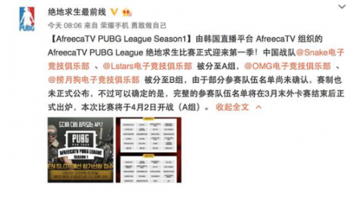 隨著絕地求生的大火,越來越多的玩家加入吃雞游戲,當然,吃雞比賽也不能少!所以就在4月2號,我們會在虎牙看到轉(zhuǎn)播的藍光畫質(zhì)的比賽直播,虎牙藍光8M全程獨播,還有神秘嘉賓激情解說和豐富的賽事節(jié)目哦!由韓國直播平臺AfreeTV組織的APL絕地求生第一賽季即將到來,本次比賽共有四支中國戰(zhàn)隊收到了邀請,他們分別是,Snake、Lstars、OMG以及撈月狗,目前該比賽的賽制還未確定,不過很快就會出爐。