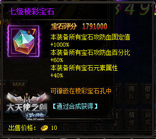 在37《大天使之劍》中,當(dāng)前棱彩寶石的最高等級(jí)為七級(jí),也就是說(shuō),當(dāng)玩家將寶石提升為七級(jí)的時(shí)候,也是將寶石屬性提升到最大化的時(shí)候,這時(shí)再將寶石鑲嵌于裝備上,能為裝備增加非常高的屬性,溫馨提醒,一件裝備最多可鑲嵌四顆棱彩寶石哦!