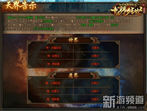 凌霄天界終于開(kāi)放了,神魔大戰(zhàn)日趨激烈,冰之神龍、火之魔龍也忍耐不住投身戰(zhàn)場(chǎng)。開(kāi)服第8天,角色等級(jí)95級(jí)以上的玩家就能進(jìn)入,每天3次天界歷練任務(wù),完成后會(huì)獲得豐厚獎(jiǎng)勵(lì)。每日12:00-:24:00期間,半個(gè)小時(shí)就會(huì)刷新一批精英怪,擊殺以后可得任務(wù)道具,打敗神族和魔族的BOSS挖掘尸體可得海量寶藏,每日12:00-24:00期間,首次擊殺神族或者魔族的三個(gè)守衛(wèi),冰之神龍或火之魔龍還會(huì)出現(xiàn)給大家送裝備。