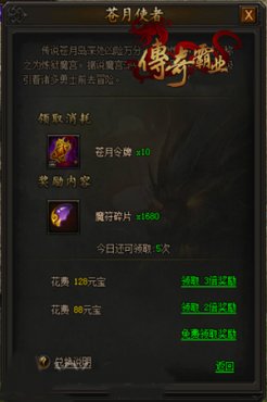 我們打到的蒼月令牌可以用來進入蒼月島的其他地圖,也可以用來在蒼月使者處領取每日的獎勵。平時在你空閑的時候就可以掛在煉獄魔宮,自動打魔宮小妖,當然最快速的方法就是手動到魔宮小妖復活點逐個擊破,不過這樣會比較耗時間,就看你們的選擇咯!