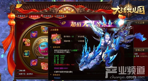 俗話說:有錢走遍天下,沒錢寸步難行。對(duì)剛進(jìn)駐《大話女兒國》的萌新們來說,游戲還尚在了解階段,為此我們推出了“幸運(yùn)轉(zhuǎn)盤”活動(dòng),為玩家們提供了極大的資源補(bǔ)充。通過商城花費(fèi)50元寶即可購買1個(gè)如意,使用如意即可在本頁面進(jìn)行抽獎(jiǎng),有機(jī)會(huì)抽取絕版坐騎外形“上古雷獸”,可以為角色增加19000的戰(zhàn)力!是不是超霸氣?