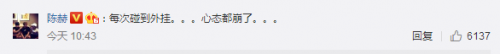 而陳赫在轉(zhuǎn)發(fā)完此條微博后應(yīng)該是感覺不解氣,還在評論里面表示:每次碰到外掛。。。心態(tài)都崩了。。。
